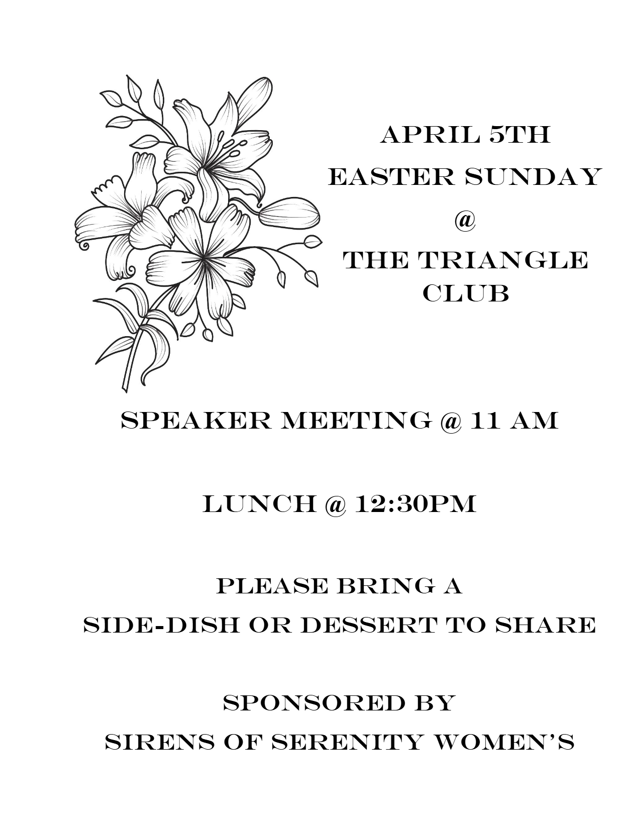 Easter Speaker Meeting – Sirens of Serenity April 5 @ 11:00 am - 2:30 pm Triangle Club 1005 SE 4th Ave., Gainesville, Florida